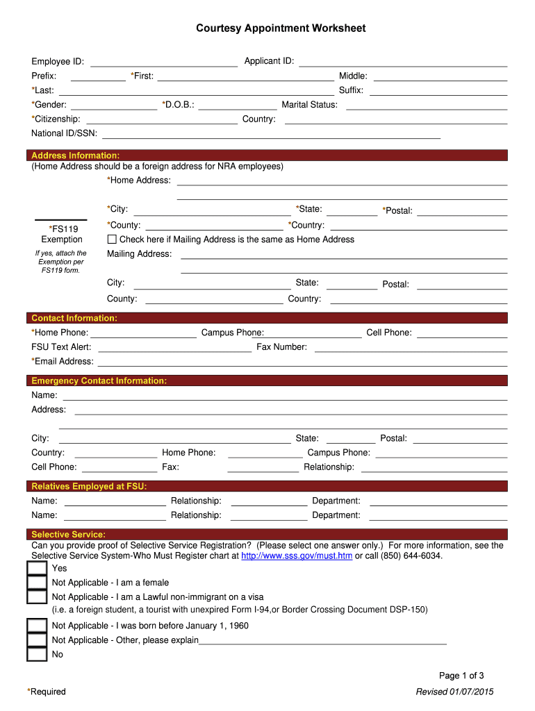 Courtesy Appointment Worksheet Applicant ID: Employee ID: *First: Prefix: Middle: *Last: Suffix: *D.O.B.: *Gender: Marital Status: *Citizenship: Country: National ID/SSN: Address Information: (Home