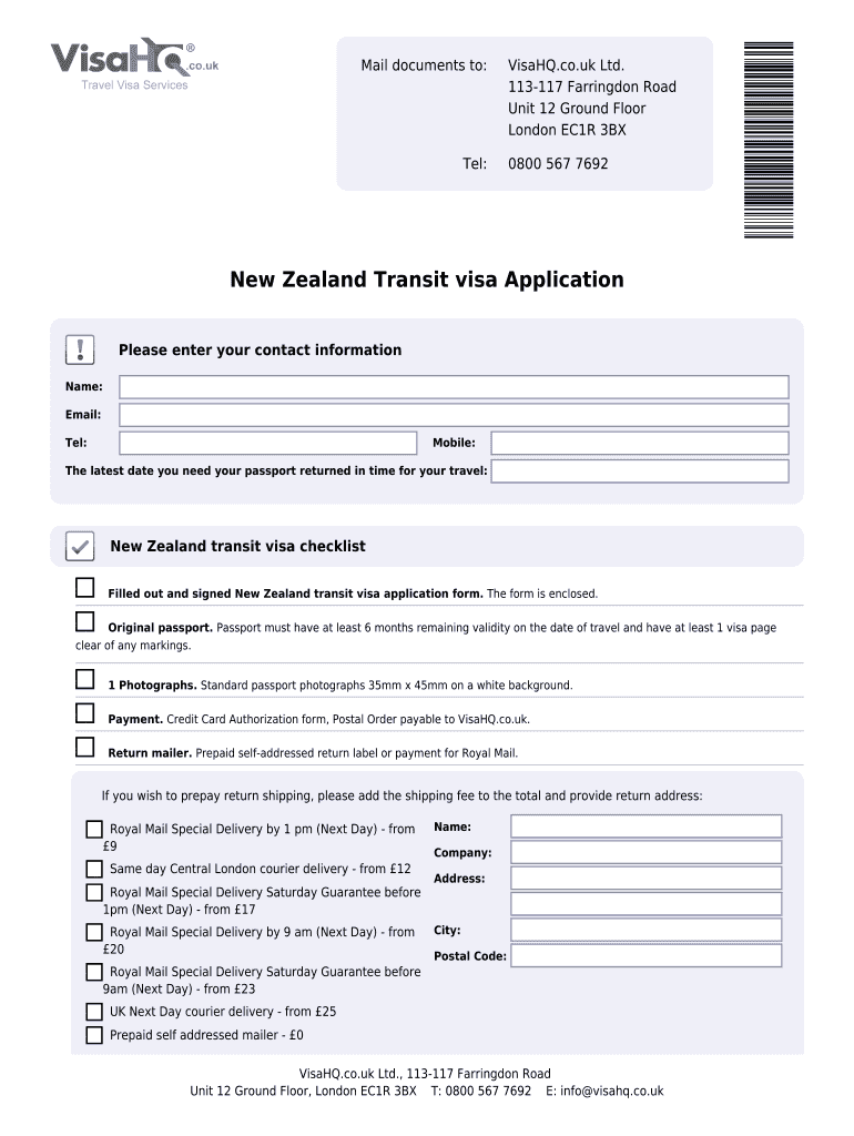 Mail documents to: Tel: Visa HQ.co.UK Ltd. 113117 Farrington Road Unit 12 First Floor London EC1R 3BX 0800 567 7692 New Zealand Transit visa Application Please enter your contact information Name: