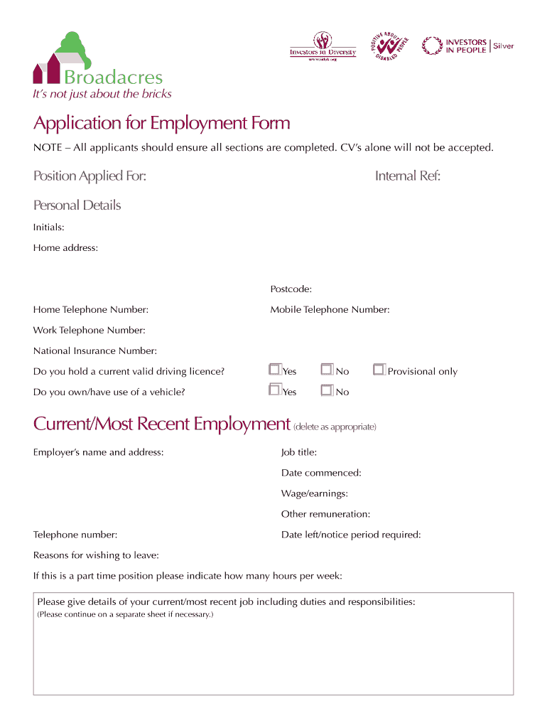 This document is an application form for individuals seeking employment with Broadacres Housing Association, requiring detailed personal, employment, and educational information.