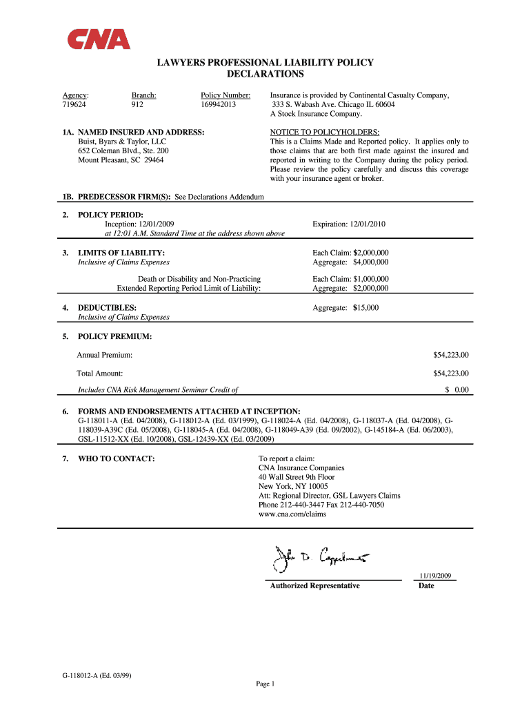 Get the free Lawyers professional liability policy declarations - Buist Byars bb