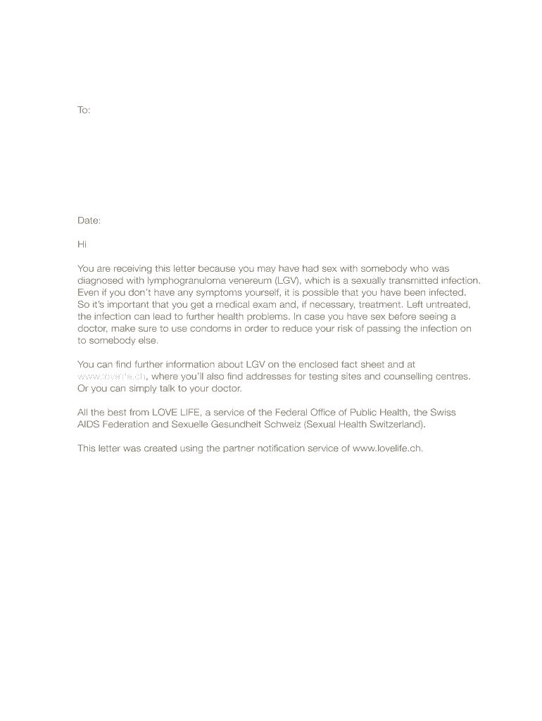 To: Date: Hi You are receiving this letter because you may have had sex with somebody who was diagnosed with lymphogranuloma venereal (LGA), which is a sexually transmitted infection. Even if you