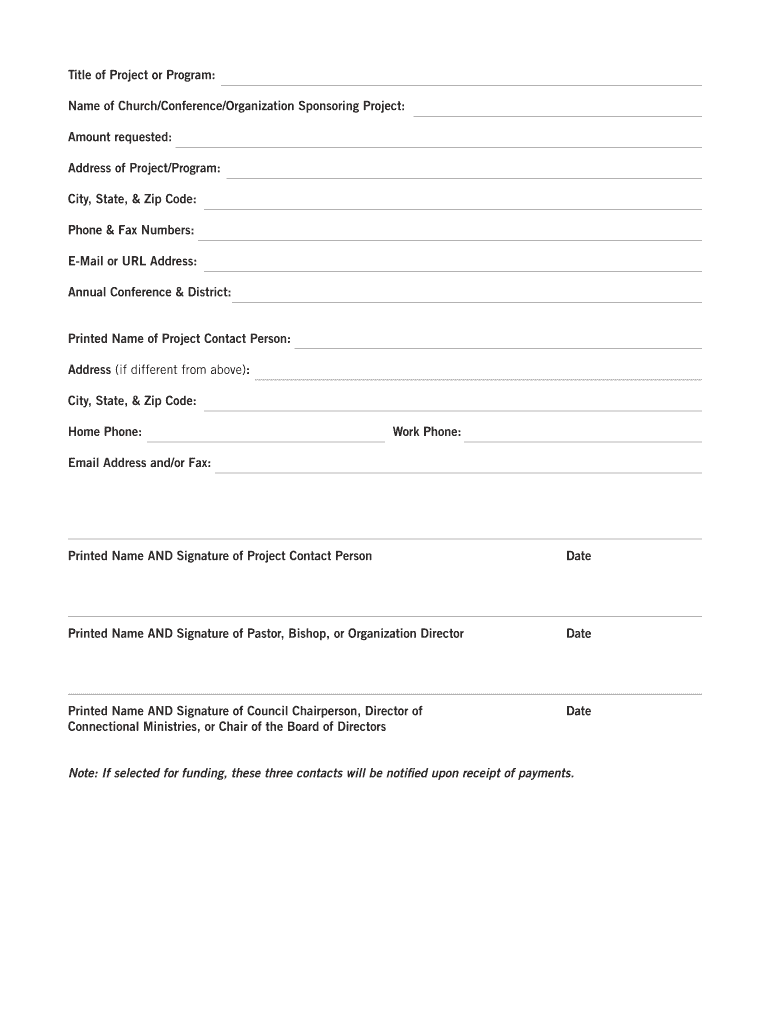 Grants for ministries can be filled out by providing detailed information about the project or initiative, budget breakdown, and expected outcomes.