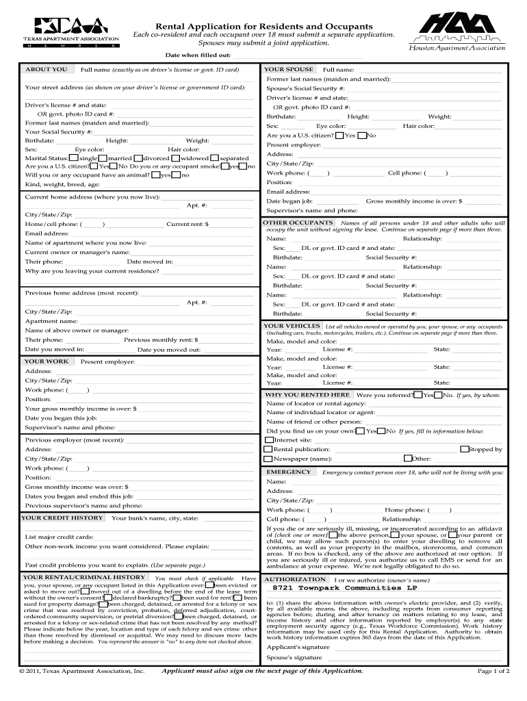 Rental Application for Residents and Occupants Each coresident and each occupant over 18 must submit a separate application. Spouses may submit a joint application. Date when filled out: ABOUT YOU