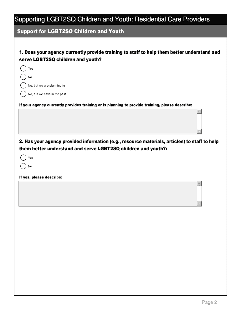 Supporting LGBT2SQ Children and Youth: Residential Care Providers About this Survey TheMinistryofChildrenandYouthServicesisdevelopingaresourceguidetohelpcaregiversand staffinthechildwelfaresystemmeettheneedsofLGBT2SQchildrenandyouth.