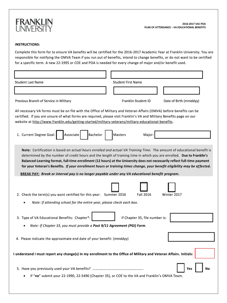 20162017 VAC POA Plans OF ATTENDANCE VA EDUCATIONAL BENEFITS INSTRUCTIONS: Complete this form for to ensure VA benefits will be certified for the 20162017 Academic Year at Franklin University. You