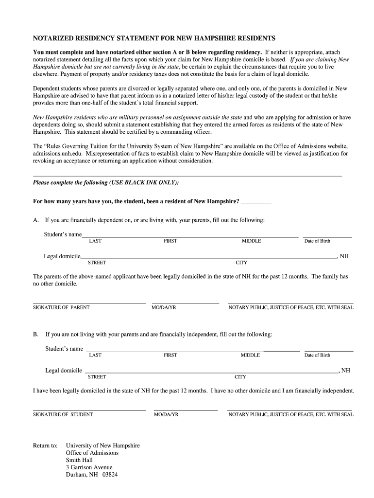 NOTARIZED RESIDENCY STATEMENT FOR NEW HAMPSHIRE RESIDENTS You must complete and have notarized either section A or B below regarding residency. If neither is appropriate, attach notarized statement