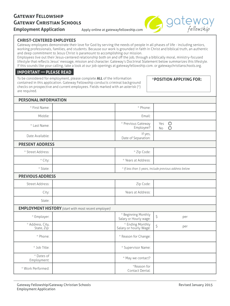Revised January 2015. Employment Application. Gateway Fellowship. Gateway Christian Schools. Employment Application. Apply online at gateway fellowship.