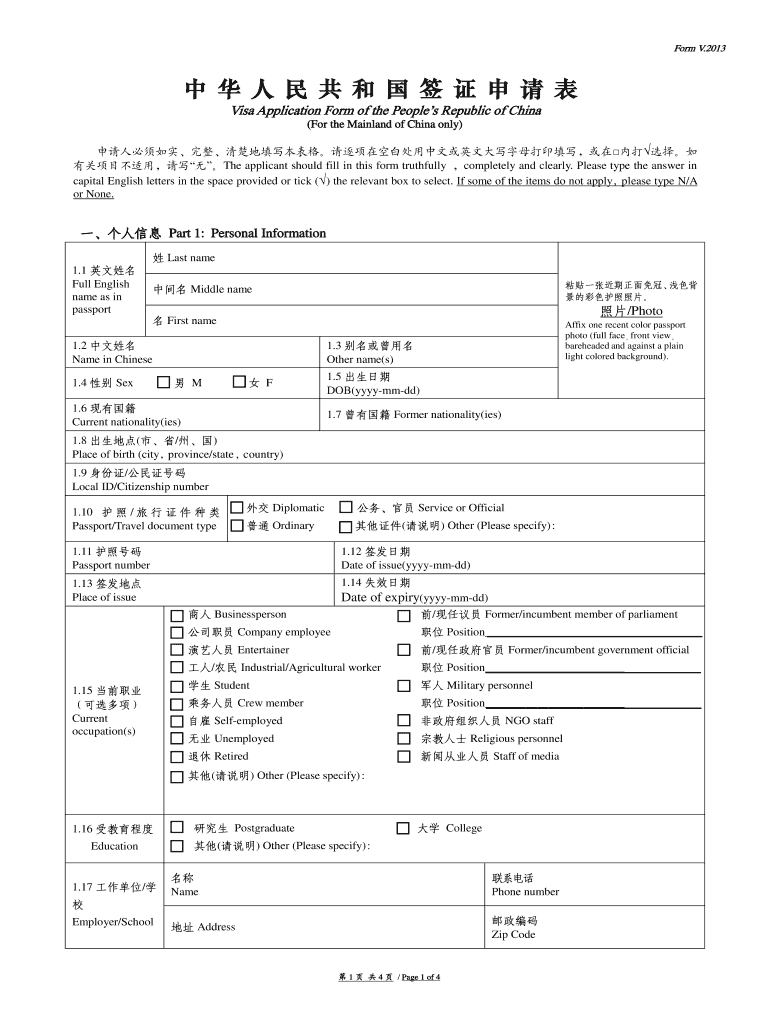 本表格用于申请中国大陆签证,申请人需如实填写个人信息、旅行信息及其他相关信息。