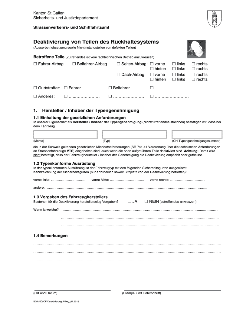 Canton St. Gallen Sicherheits- UND Justizdepartement Strassenverkehrs- UND Schifffahrtsamt Siva SG/OF-Deaktivierung Airbag×07.2013 Deaktivierung on Taken DES ...