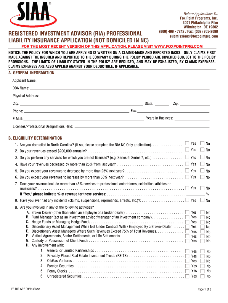 REGISTERED INVESTMENT ADVISOR (RIA) PROFESSIONAL LIABILITY INSURANCE APPLICATION (NOT DOMICILED IN NC) Return Applications To: Fox Point Programs, Inc.