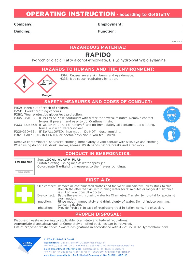 OPERATING INSTRUCTION according to GefStoffV Company: Employment: Building: Function: Date: 11.05.15 HAZARDOUS MATERIAL: RAPID Hydrochloric acid, Fatty alcohol methylate, Bis (2-hydroxyethyl) examine