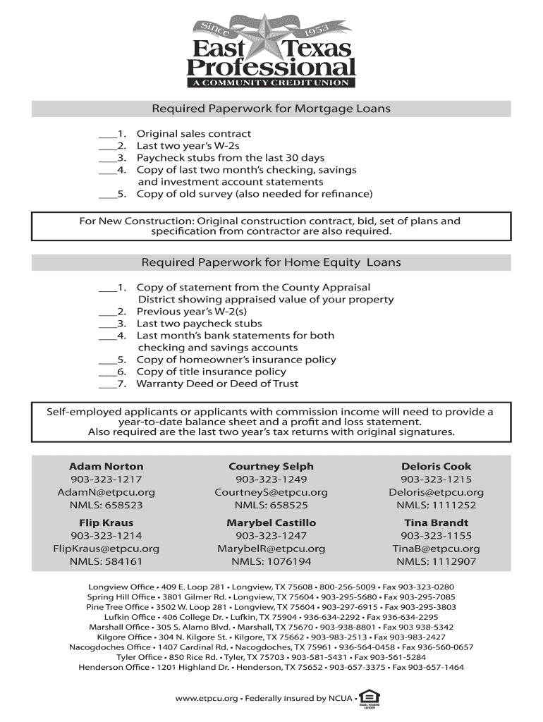 Get the free Required Paperwork For Mortgage Loans - East Texas Professional bb - etpcu