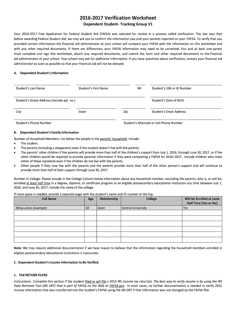 2016-2017 Verification Worksheet. Dependent Student- Tracking Group V1. Yo-2017 Free your 2016 Application for Federal Student Aid (FAFSA) was selected for review in ...