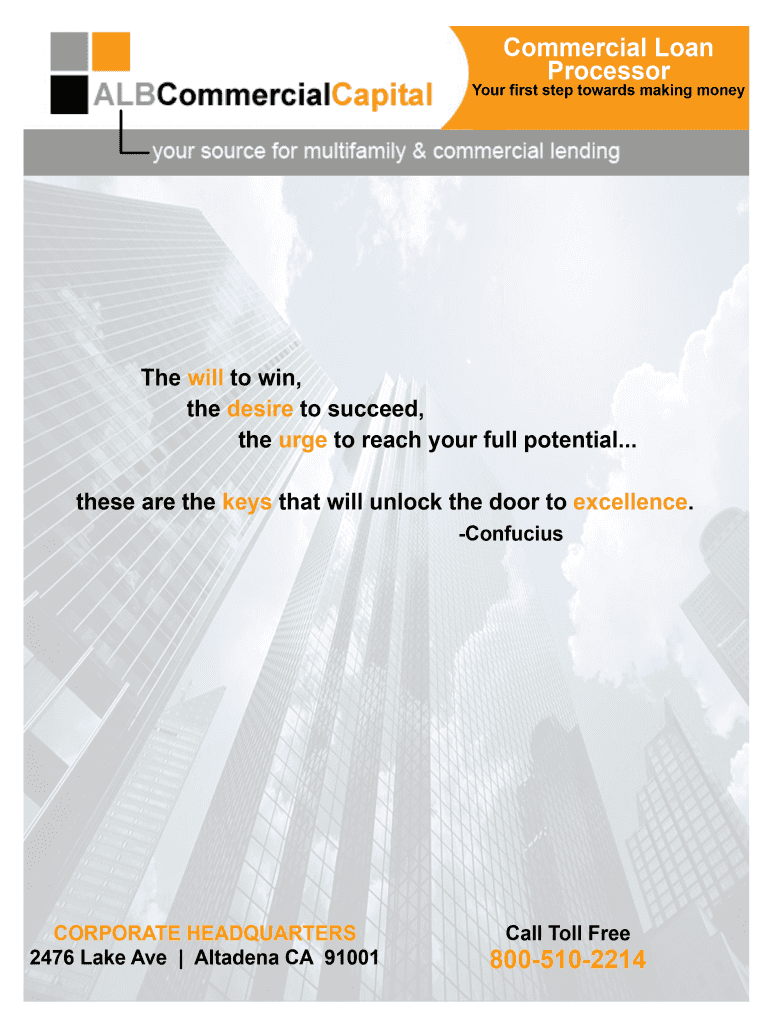 This document is an employment application for the position of Commercial Loan Processor at ALB Commercial Capital, detailing job responsibilities, benefits, and sections for personal information,