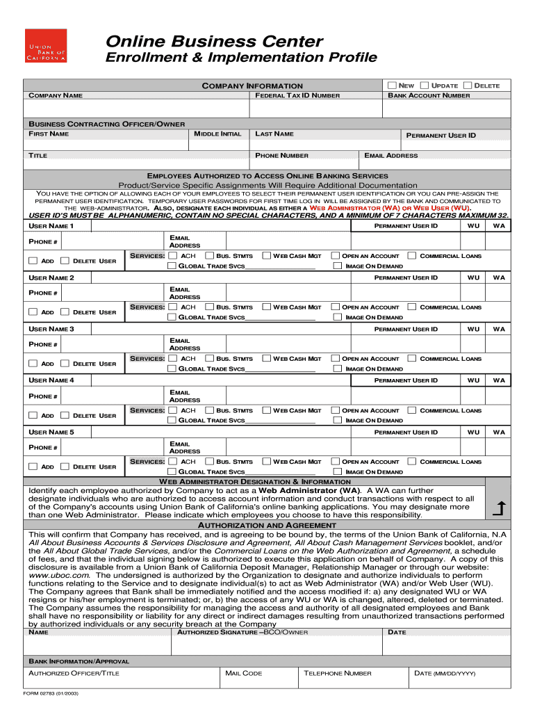 The Online Business Center Enrollment Form is a crucial document businesses utilize to enroll in online banking services with Union Bank of California. This form is central to establishing access to various banking functionalities. Completing the form accurately ensures that businesses can effectively manage their financial transactions online. It is essential for business owners to provide precise information to avoid any delays in service initiation.