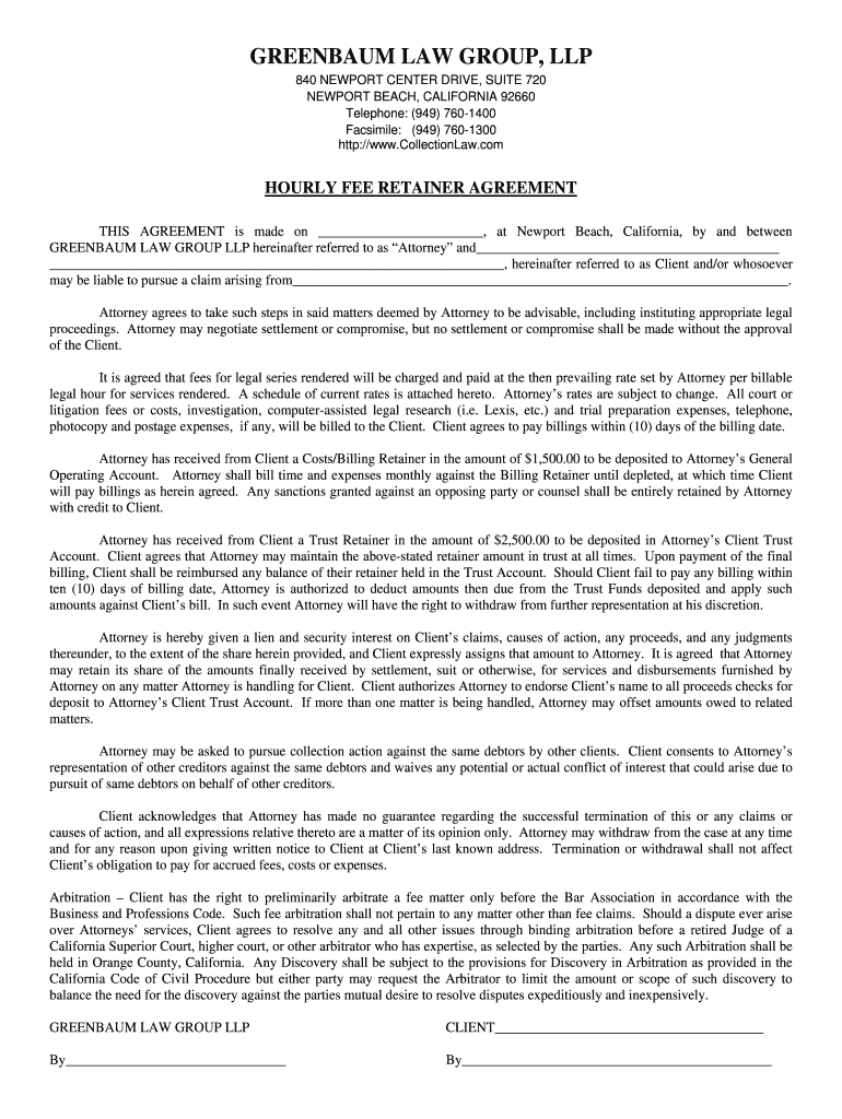GREENBACK LAW GROUP, LLP 840 NEWPORT CENTER DRIVE, SUITE 720 NEWPORT BEACH, CALIFORNIA 92660 Telephone: (949) 7601400 Facsimile: (949) 7601300 http://www.CollectionLaw.com HOURLY FEE RETAINER AGREEMENT