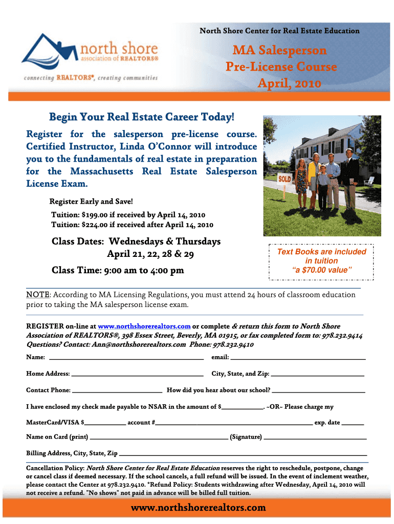 This document provides information about the Massachusetts Salesperson Pre-License Course, including registration details, class dates, tuition fees, and cancellation policies.