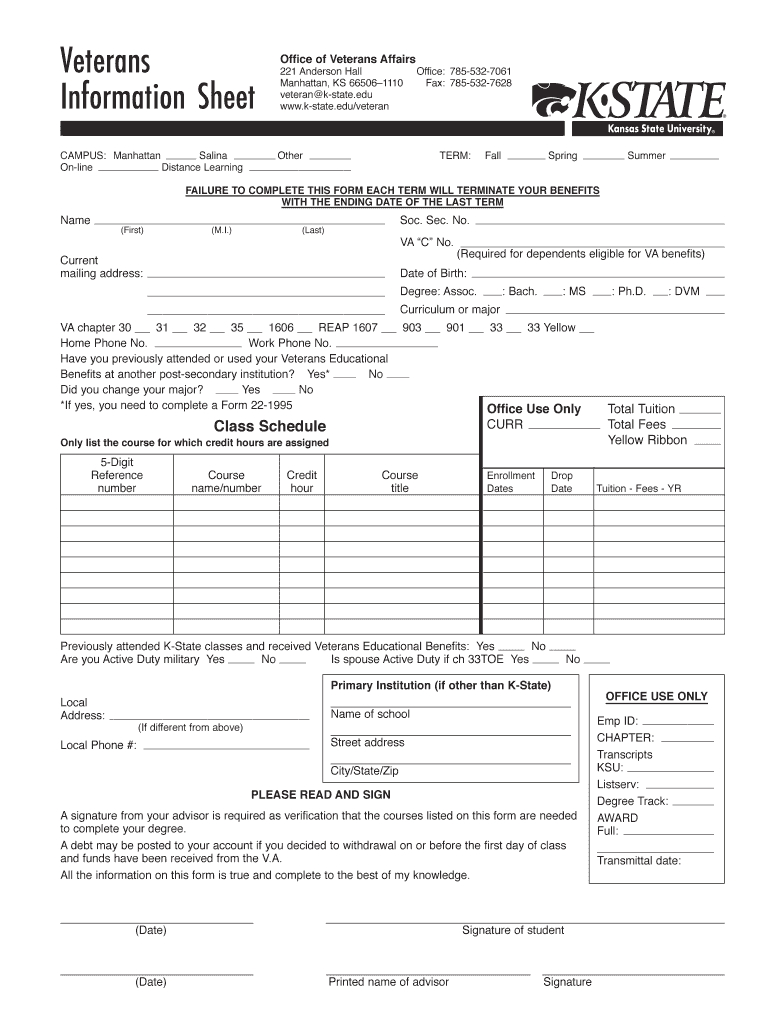Www.k-state.edu/veteran ... VA chapter 30 31 32 35 1606 REAP 1607 903 ... *If yes, you need to complete a Form 22-1995.