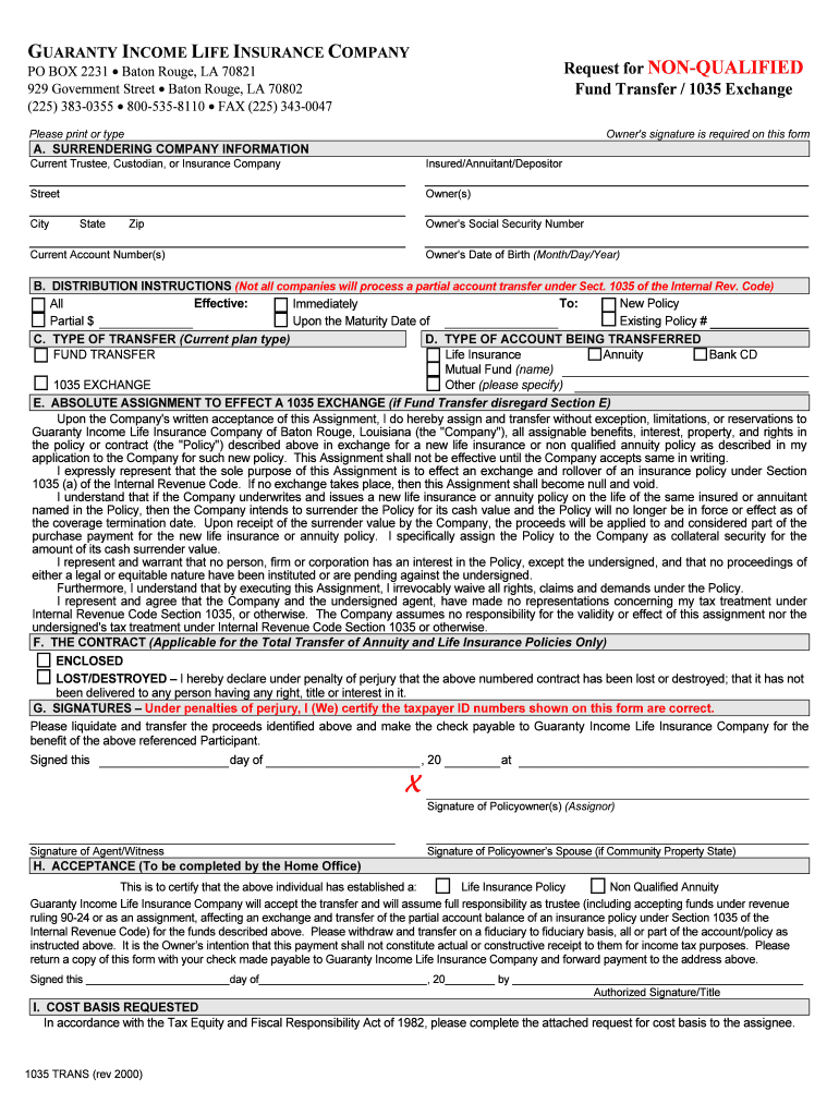 Key Features of the Guaranty Income Life Insurance 1035 Exchange Form