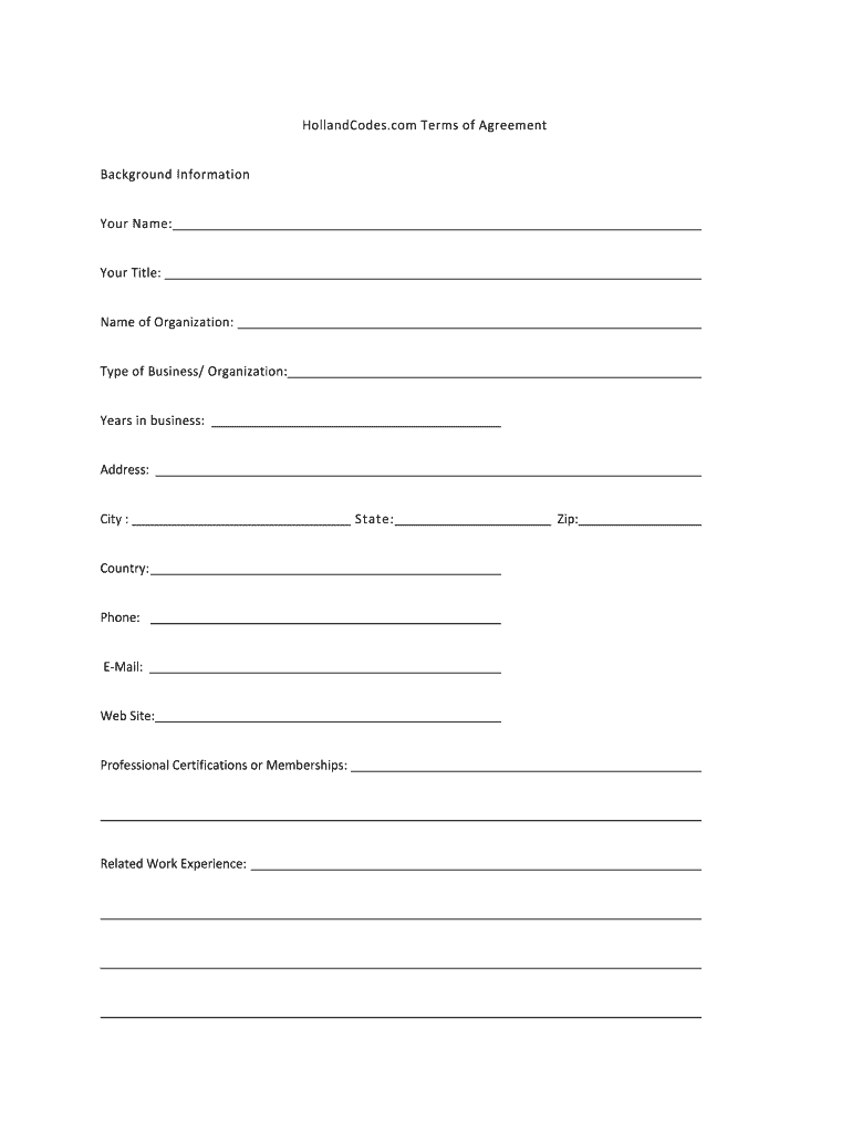 HollandCodes.com Terms of Agreement. Background Information. Your Name: Your Title: Name of Organization: Type of Business/ Organization: Years in business :