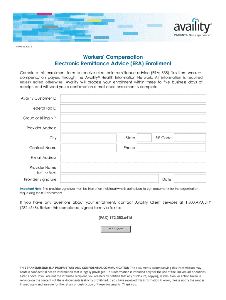 This form is intended for healthcare providers who want to enroll in electronic remittance advice services from workers’ compensation payers through Availity. Ensure you have the required identifiers before starting.