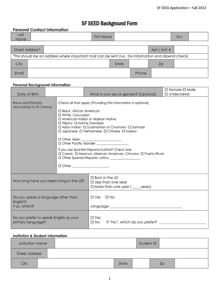 SF IDEA Application Fall 2012 SF SEED Background Form Personal Contact Information Last Name First Name M.I. Street Address* Apt./ Unit # *This should be an address where important mail can be sent
