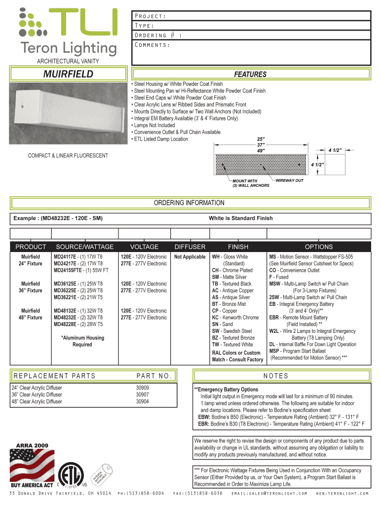 ARCHITECTURAL VANITY AIRFIELD SENSOR PRODUCT SOURCE/WATTAGE VOLTAGE DIMMING CONFIG FINISH OPTIONS Muir field 24 Fixture Muir fields 36 Fixture Muir fields