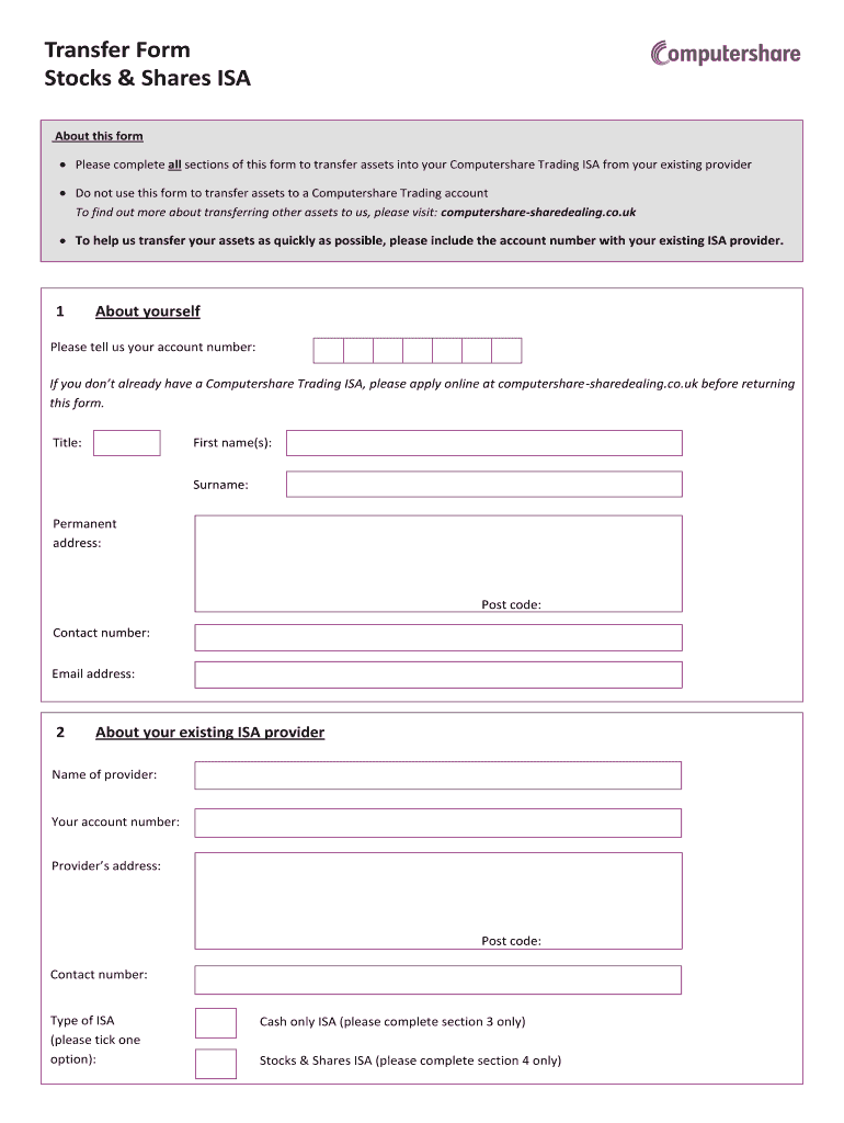 Please complete all sections of this form to transfer assets into your Computer share Trading ISA from your existing provider