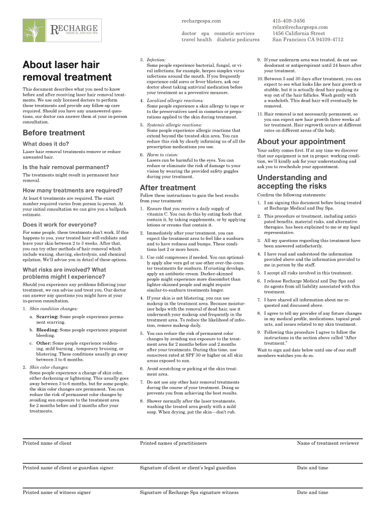 To fill out about laser hair removal, one must provide details of the services offered, equipment used, and any safety measures taken.