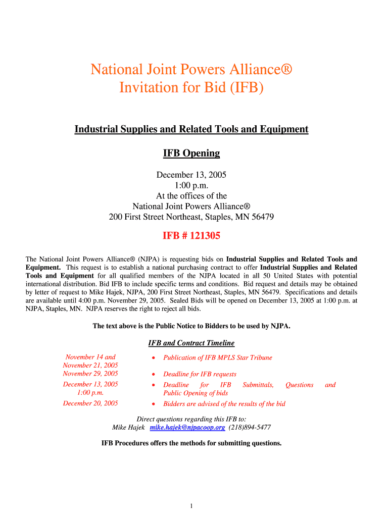 The National Joint Powers Alliance® Invitation for Bid (IFB) is a procurement document issued by the NJPA to solicit offers from suppliers and contractors for the provision of goods and services to its members.