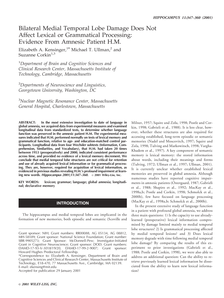 HIPPOCAMPUS 11:347360 (2001) Bilateral Medial Temporal Lobe Damage Does Not Affect Lexical or Grammatical Processing: Evidence From Amnesic Patient H.M. Elizabeth A. Ken singer,1* Michael T. Pullman,2