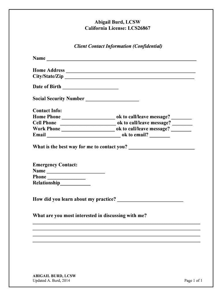 Abigail Bird, LCSW California License: LCS26867 Client Contact Information (Confidential) Name Home Address City/State/Zip Date of Birth Social Security Number Contact Info: Home Phone ok to call/leave