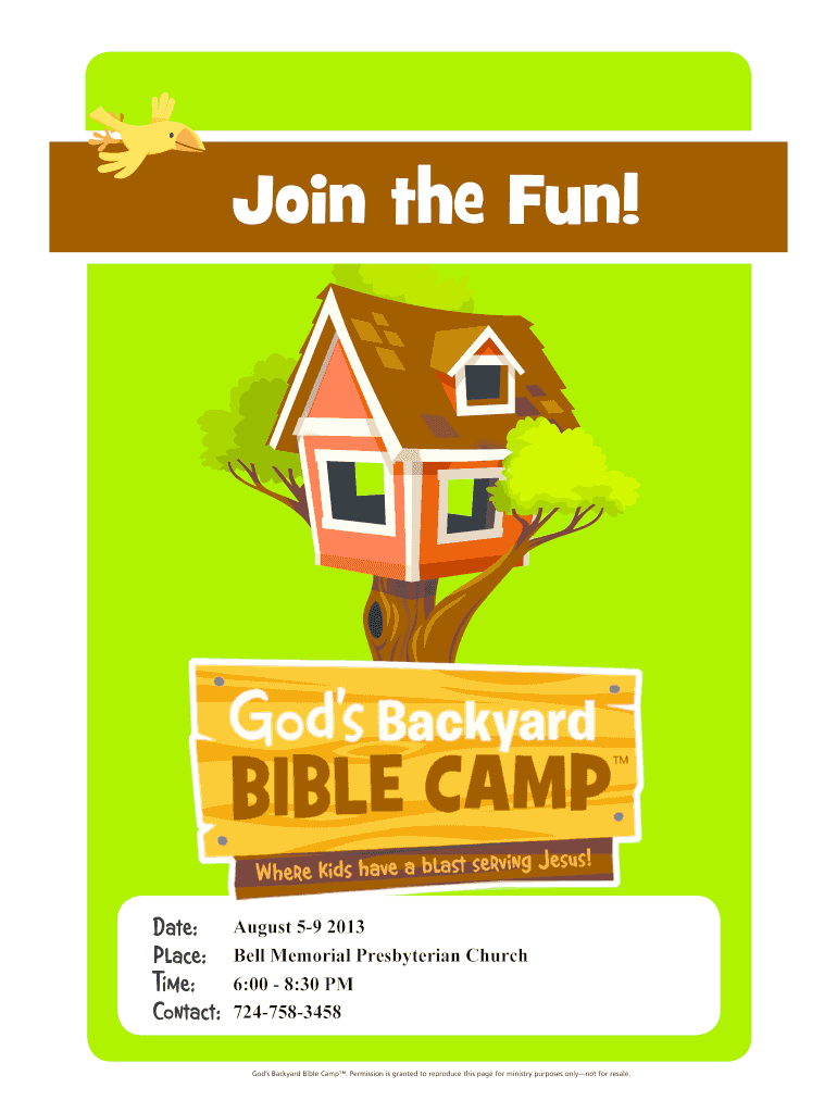 Join the Fun! Date: Place: Time: Contact: God s Backyard Bible Camp. Permission is granted to reproduce this page for ministry purposes only not for resale.