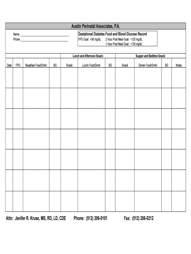 Austin Perinatal Associates, P.A. Name Phone Gestational Diabetes Food and Blood Glucose Record RPG Goal: 95 mg/DL 2 Hour Post Meal Goal: 120 mg/DL 1 Hour Post Meal Goal: 130 mg/DL Supper and Bedtime