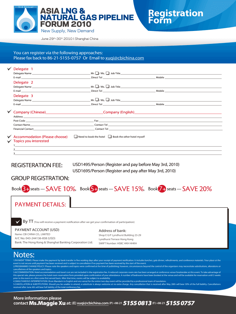 3rd Annual 3 r d A n n u a ll ASIA LNG & NATURAL GAS PIPELINE FORUM 2010 Registration Form New Supply, New Demand June 29th30th 2010 I Shanghai China You can register via the following approaches: