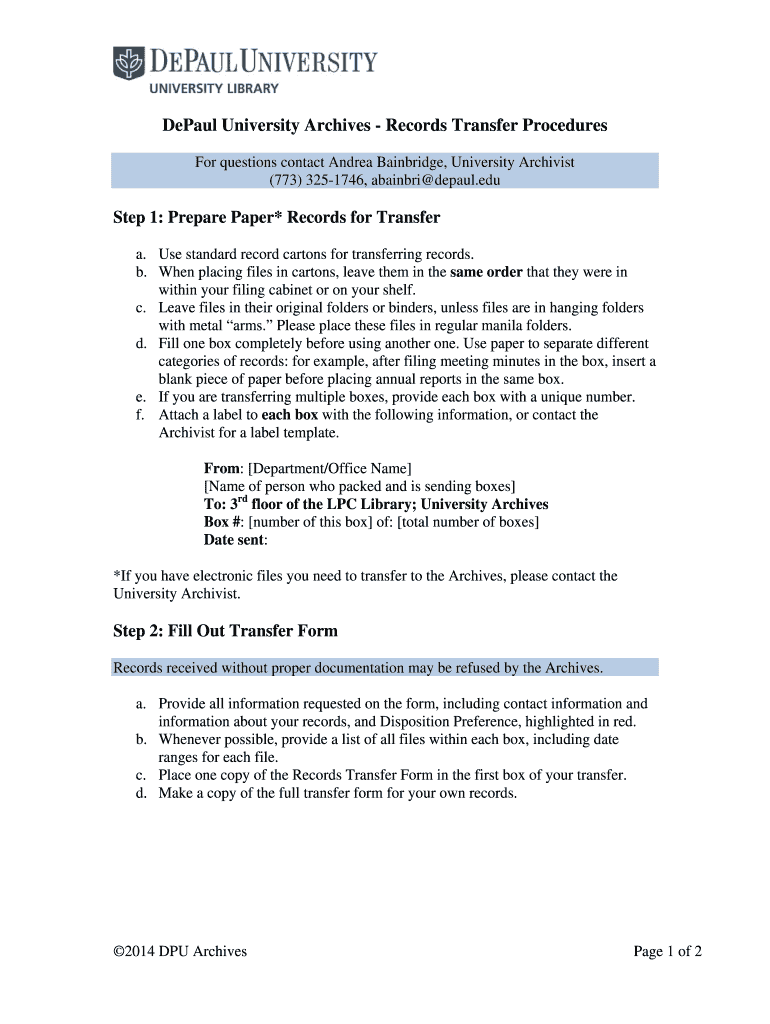 DePaul University Archives Records Transfer Procedures For questions contact Andrea Bainbridge, University Archivist (773) 3251746, AB InBev DePaul.edu Step 1: Prepare Paper* Records for Transfer
