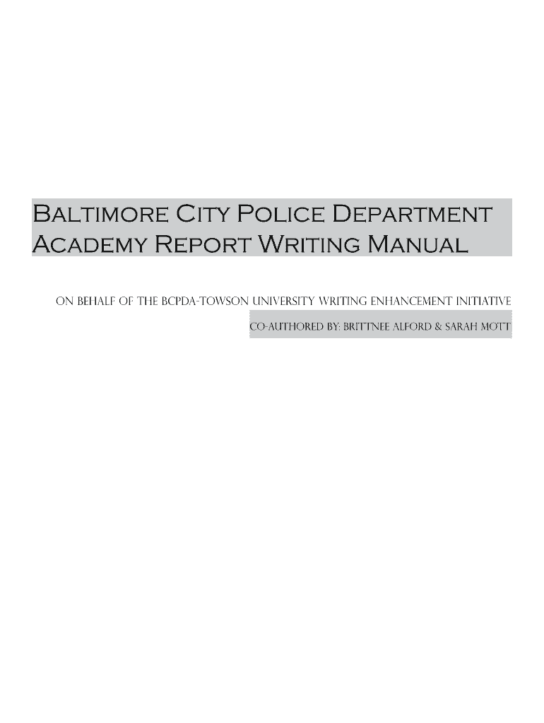 Baltimore City Police Department Academy Report Writing Manual on behalf of the bcpdatowson university writing enhancement initiativeCoauthored By: Brittney Alford & Sarah mott2TableofContents INTRODUCTION......................................................................................................................................