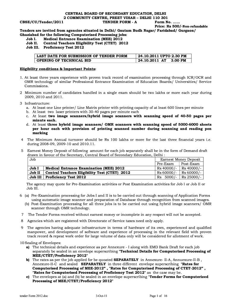 The CBSE Tender Form A is a tender application document used by agencies in Delhi to submit bids for computerized processing jobs related to educational examinations.