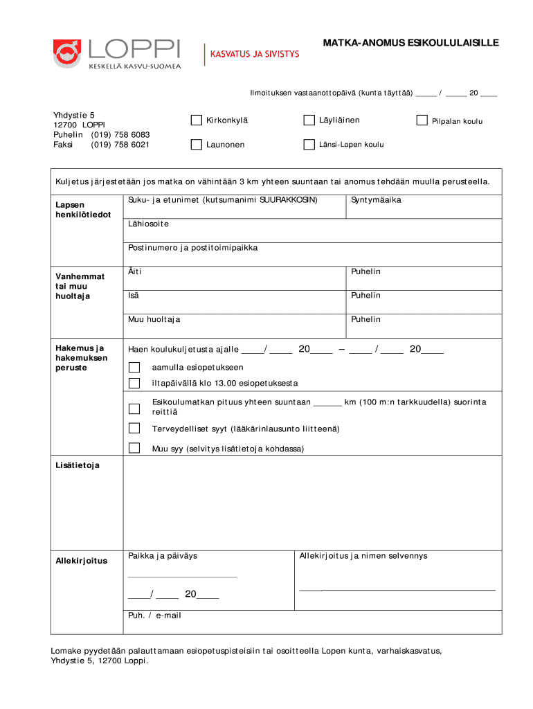 MATKA-ANOMUS ESIKOULULAISILLE. Ilmoituksen vastaanottop iv (junta t yet) / 20 Christie 5 12700 LIPPI. Public (019) 758 6083