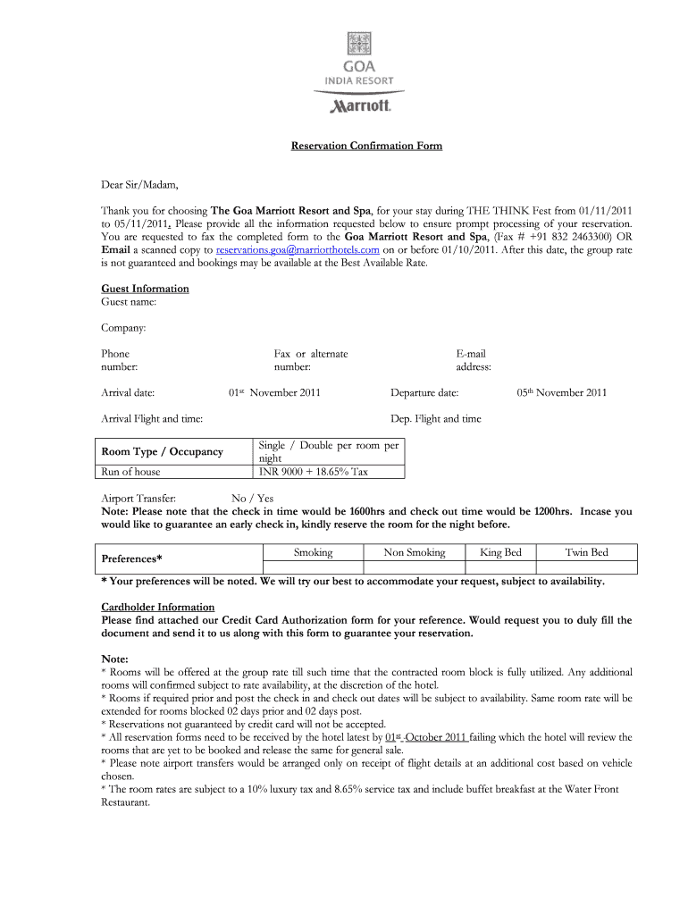 Thank you for choosing The Goa Marriott Resort and Spa, for your stay during THE THINK Fest from 01/11/2011