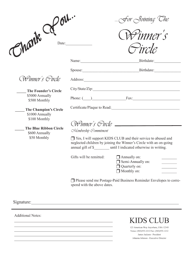 ... of a h Y k T Date: ... For Joining The Winners Circle Name: Birthdate: Spouse: Birthdate: Winners Circle The Founders Circle $5000 Annually $500 Monthly The Champions Circle $1000 Annually $100