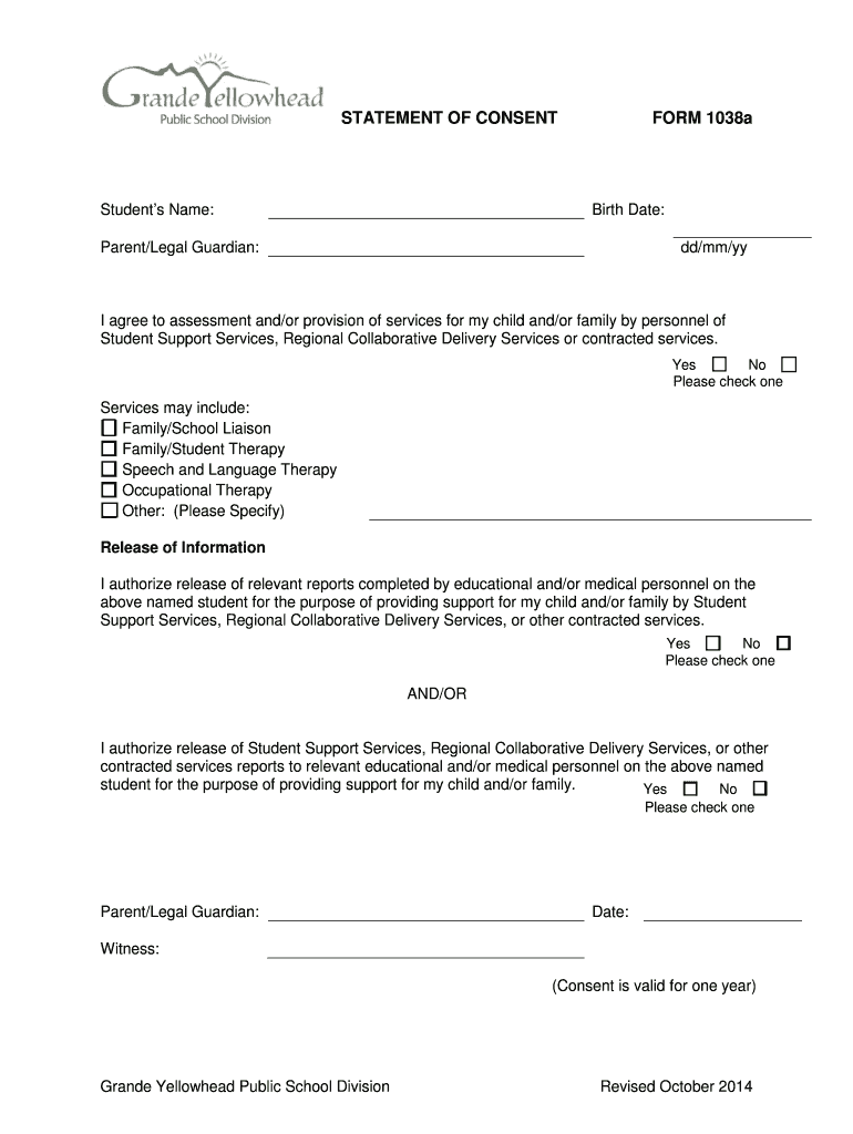 STATEMENT OF CONSENT. FORM 1038a. Students#39’s Name: Birth Date: Parent/ Legal Guardian: dd/mm/by. I agree to assessment and/or provision of services for ...