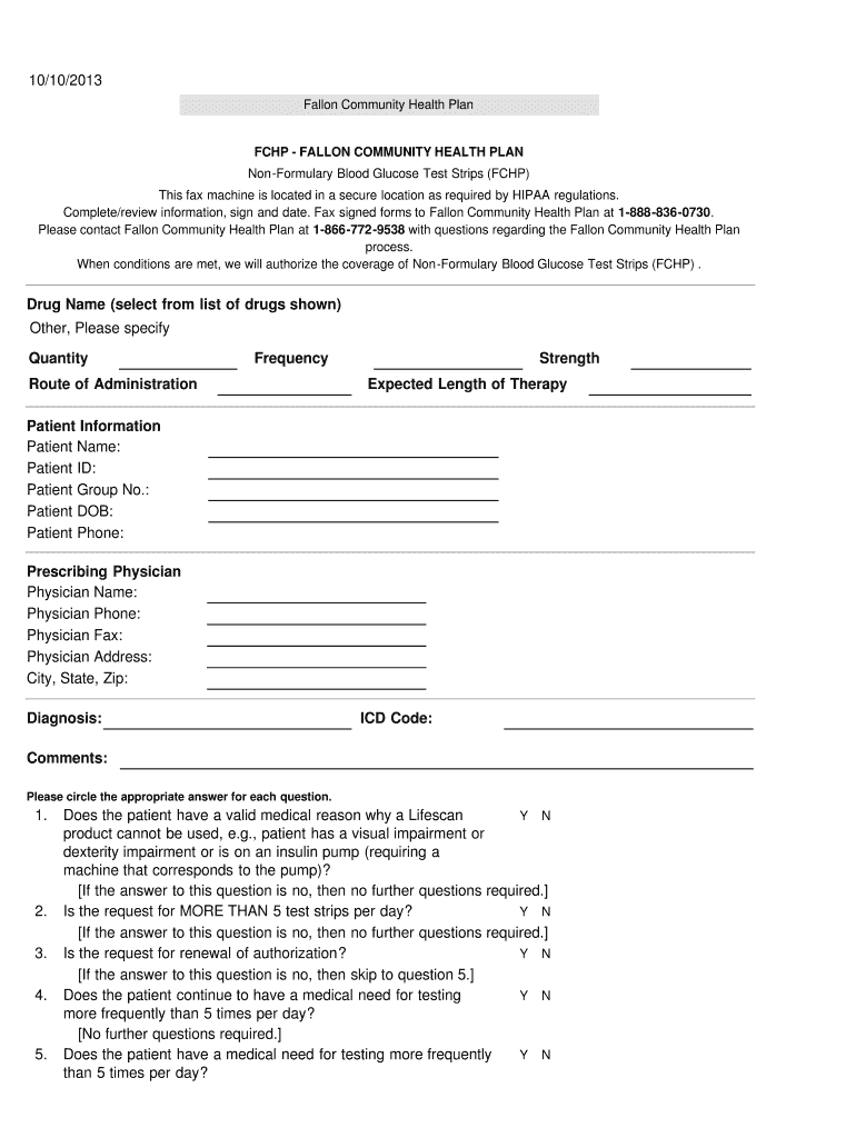 Prior Authorization Criteria Form 10/10/2013 Fallon Community Health Plan CHP FALLON COMMUNITY HEALTH PLAN Formulary Blood Glucose Test Strips (CHP) This fax machine is located in a secure location