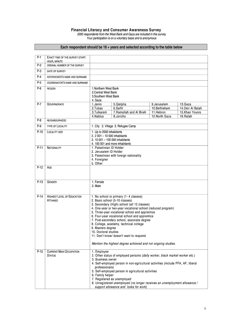 The Financial Literacy Survey Form is designed to gather essential data on financial literacy and consumer awareness specifically in the West Bank and Gaza. This form plays a crucial role in understanding how well individuals in these regions comprehend financial concepts and services.