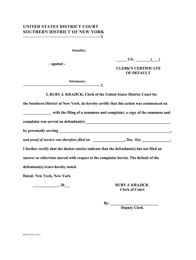 Get the free Clerk's Certificate of Default - US District Court Southern District of ...