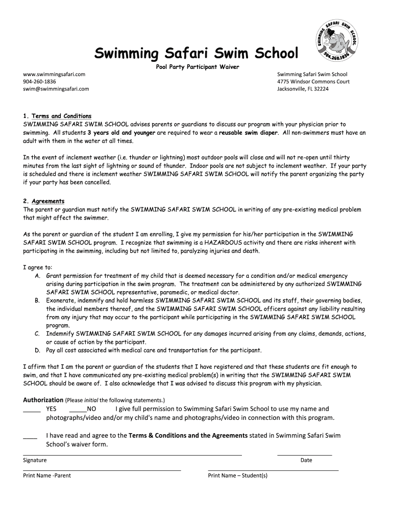 Swimming Safari Swim School www.swimmingsafari.com 9042601836 swim swimmingsafari.com Pool Party Participant Waiver Swimming Safari Swim School 4775 Windsor Commons Court Jacksonville, FL 32224 1.