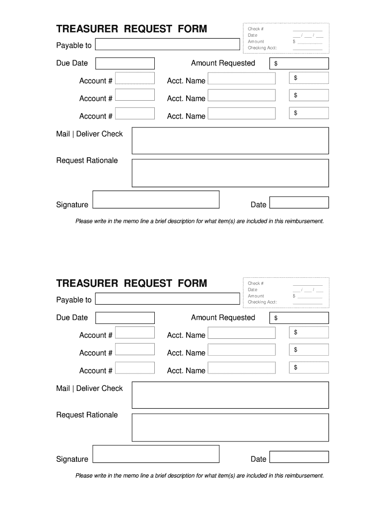 TREASURER REQUEST FORM Payable to Due Date Check # Date Amount Checking Acct: Amount Requested / / $ $ Account # Acct. Name $ Account # Acct. Name $ Account # Acct. Name $ Mail Deliver Check Request