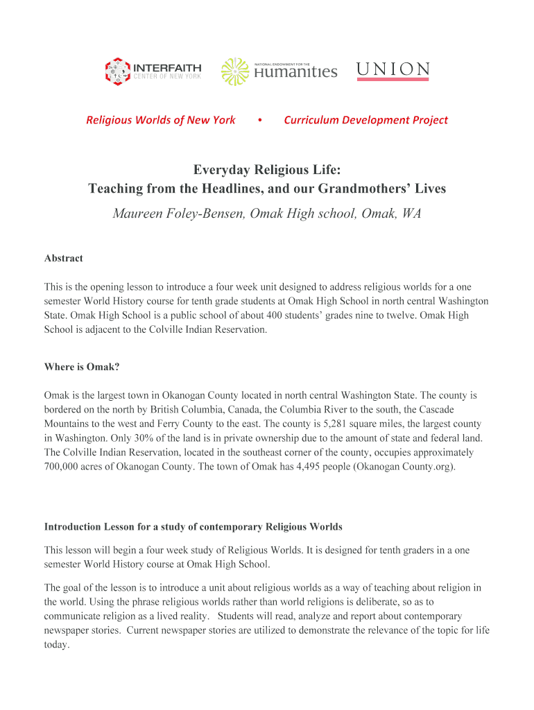 Religious Worlds of New York Curriculum Development Project Everyday Religious Life: Teaching from the Headlines, and our Grandmothers Lives Maureen FoleyBensen, Oak High school, Oak, WA Abstract