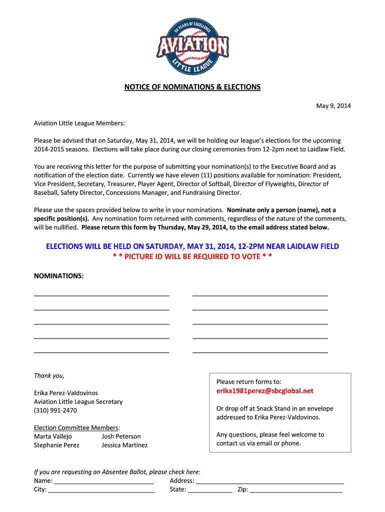 Get the free NOTICE OF NOMINATIONS ELECTIONS - Aviation Little League