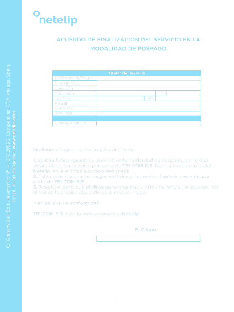 ACTED DE FINALIZED N DEL SERVICE EN LA MODALITY DE POSTAGE Titular Del service Ran n social/Titular DNI/NIF/NICE Direct n Pollack n Tel photo E-mail Contact Provincial C.P. FAX Cent/s Netflix Mediate